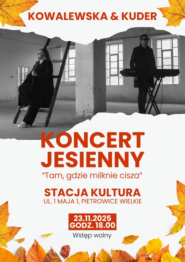 Stacja Kultura w Pietrowicach Wielkich zaprasza na wyjątkowy koncert duetu Kowalewska & Kuder, który odbędzie się 23 listopada 2025 r. o godz. 18:00. Jesienny wieczór wypełni muzyka pełna subtelności, emocji i kameralnego klimatu.