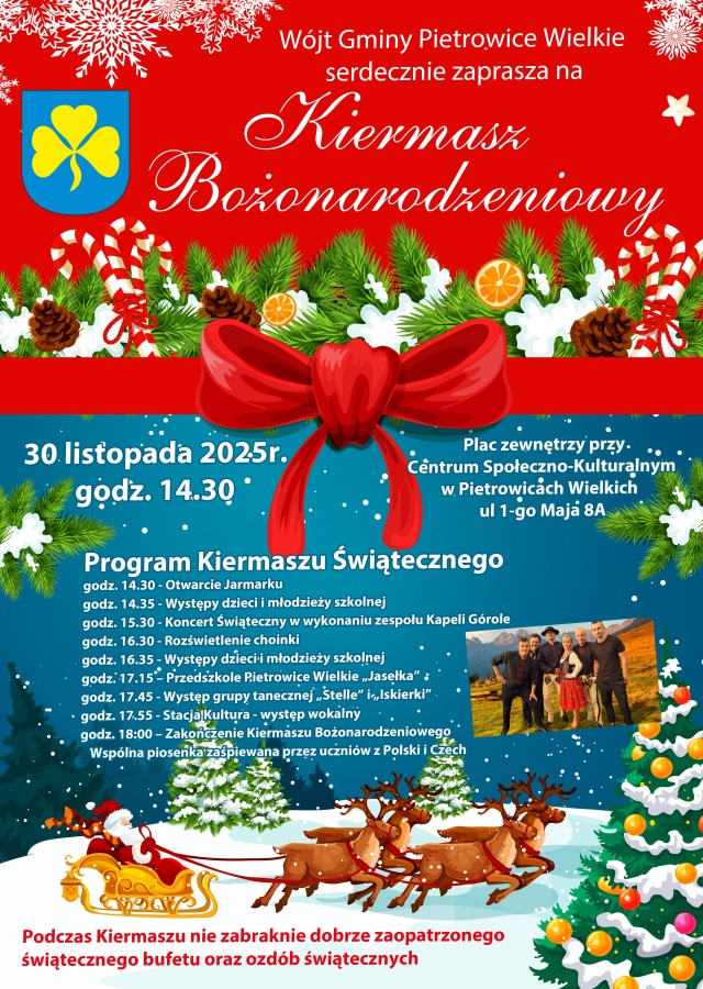 Wójt Gminy Pietrowice Wielkie ma zaszczyt serdecznie zaprosić wszystkich mieszkańców oraz gości na tradycyjny Kiermasz Bożonarodzeniowy, który odbędzie się w niedzielę, 30 listopada 2025 roku.