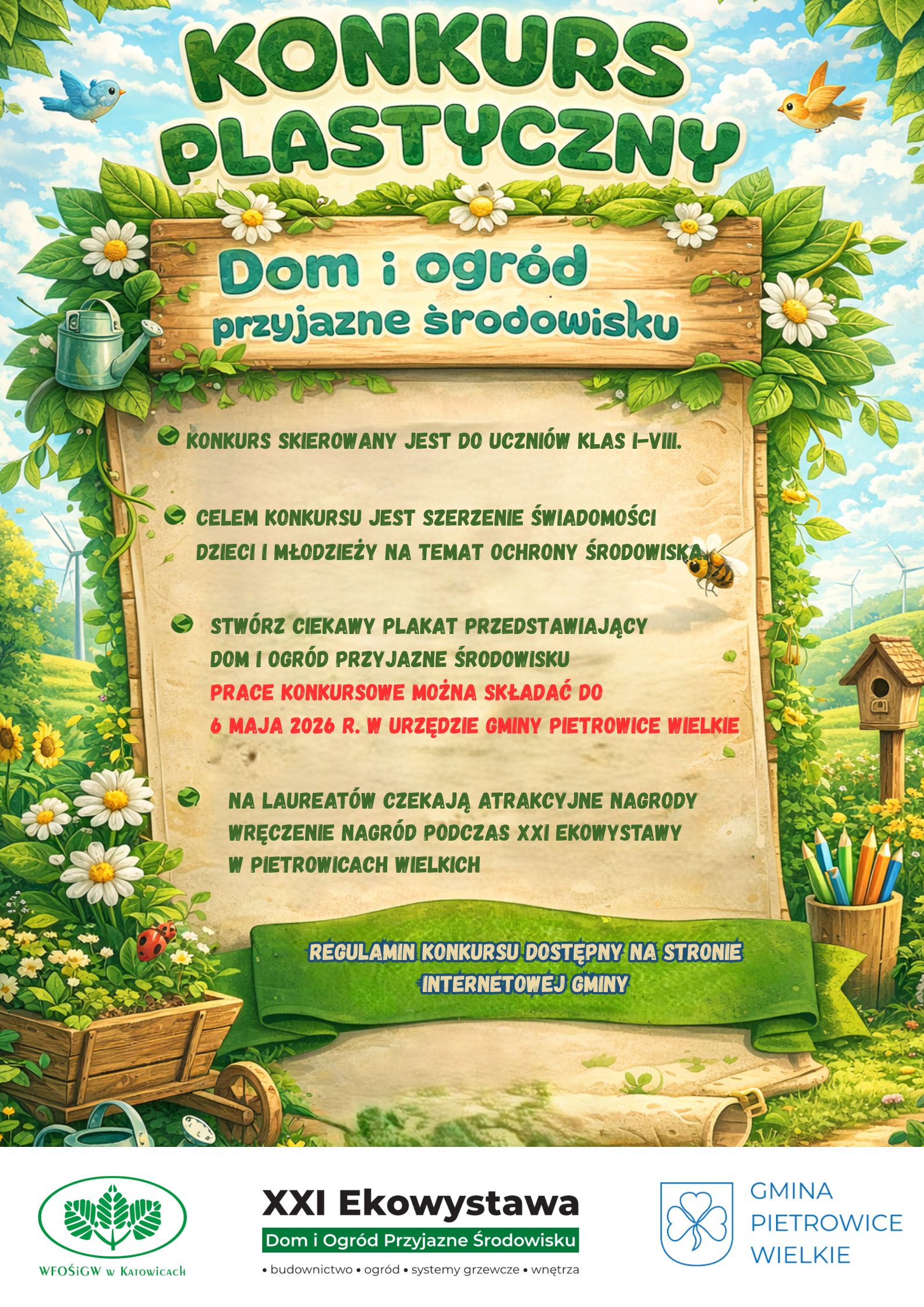 Zapraszamy wszystkich uczniów do udziału w konkursie na plakat Ekologiczny organizowanym w ramach XXI Ekowystawy " Dom i ogród przyjazne środowisku". Szczegóły w załączonym Regulaminie oraz na plakacie.