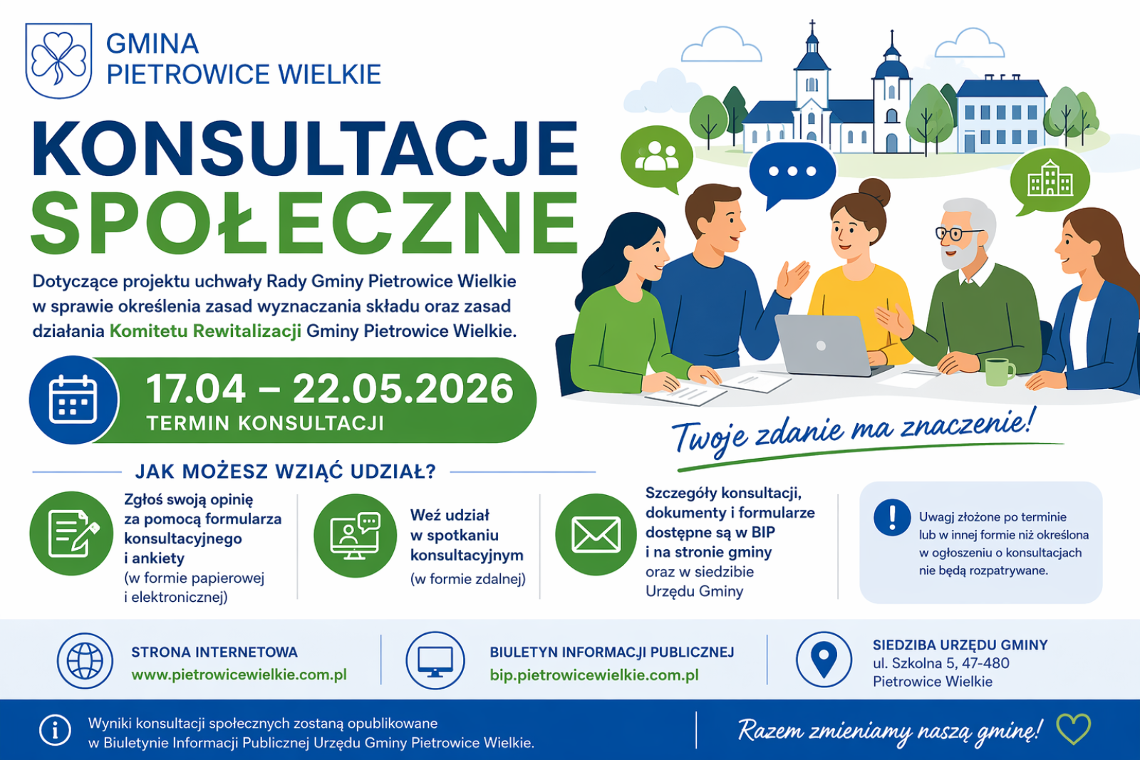 Wójt Gminy Pietrowice Wielkie serdecznie zaprasza mieszkańców, lokalnych przedsiębiorców, przedstawicieli organizacji pozarządowych oraz wszystkich interesariuszy rewitalizacji do aktywnego udziału w konsultacjach społecznych. Przedmiotem konsultacji jest projekt uchwały Rady Gminy określający zasady wyznaczania składu oraz zasady działania Komitetu Rewitalizacji.